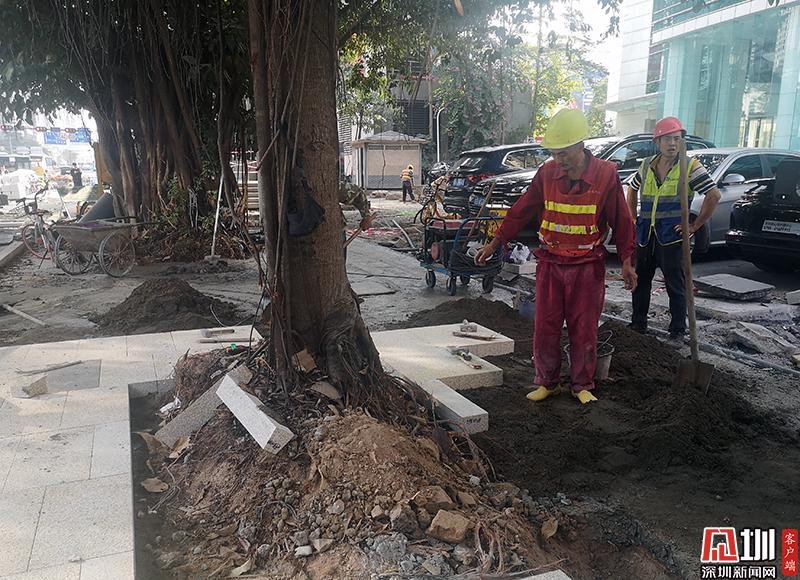 上午10點(diǎn),深圳市交通運(yùn)輸局執(zhí)法人員來到福田區(qū)民田路與福華路路口的一處施工現(xiàn)場(chǎng)。記者在現(xiàn)場(chǎng)看到,沿著福華路一側(cè)的人行道基本全部被挖開,建筑工人正在進(jìn)行人行道石磚的鋪設(shè)工作,由于施工圍擋布置不規(guī)范,現(xiàn)場(chǎng)也沒有完善的路線指引,不少市民出行受阻。