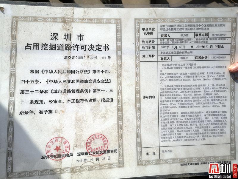 記者在現(xiàn)場了解到,目前該路段正在進(jìn)行福田中心區(qū)道路品質(zhì)改善提升工程的施工,施工單位為中建七局。從現(xiàn)場的占道施工許可證上,記者看到該項目自2019年8月份開始占道施工,預(yù)計2019年12月31日完工。