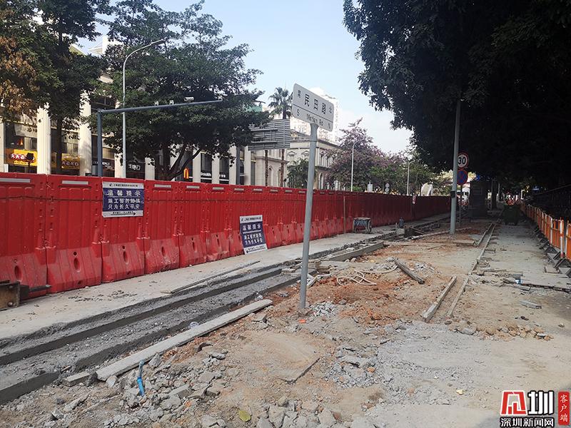 在福中三路和民田路交叉口的施工現(xiàn)場,民田路一側(cè)的人行道幾乎被全部“扒開”。