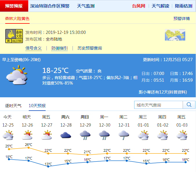 見圳客戶端·深圳新聞網(wǎng)2019年12月25日訊 25-26日多云間晴天,有輕霧或霾;26日夜間至27日冷空氣影響,風(fēng)力加大,沿海、高地和海區(qū)最大陣風(fēng)7級左右,氣溫下降,天氣轉(zhuǎn)涼,最低氣溫14℃;28日夜間-31日轉(zhuǎn)陰雨天氣。