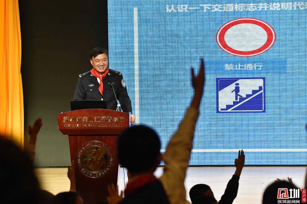 2019年2月20日,南山區(qū)荔香學(xué)校,市交警局局長(zhǎng)徐煒正在向?qū)W生們講述交通安全知識(shí)。為加強(qiáng)2019年度新學(xué)期校園交通安全宣傳工作,深圳交警聯(lián)合市教育局在新學(xué)期開學(xué)期間,在全市范圍開展“交通安全教育第一課”授課活動(dòng)。