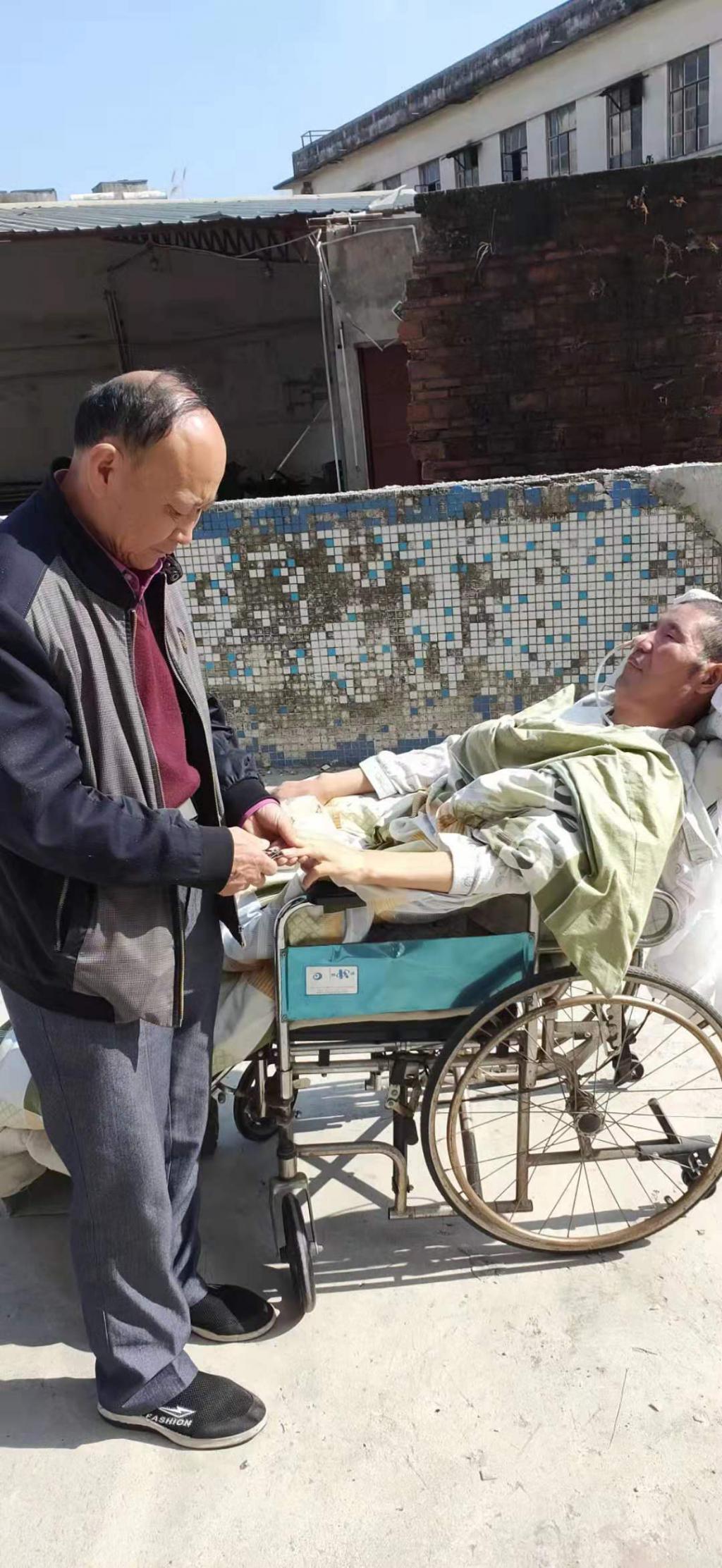 今年1月3日中午,大晴天,劉林把女婿劉建榮從床上背起,小心翼翼地轉(zhuǎn)移到輪椅上。一遇上好天氣,他準(zhǔn)會(huì)帶女婿出門曬曬太陽。劉林今年68歲,體力大不如前,把一個(gè)植物人背下床對(duì)他來講并不容易。"盡管再累也要堅(jiān)持。"劉林說。
