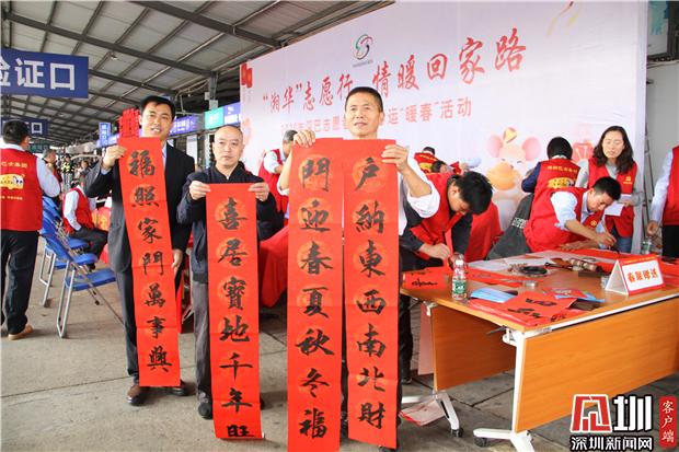 深圳巴士集團志愿者現(xiàn)場寫春聯(lián)贈給返鄉(xiāng)旅客。