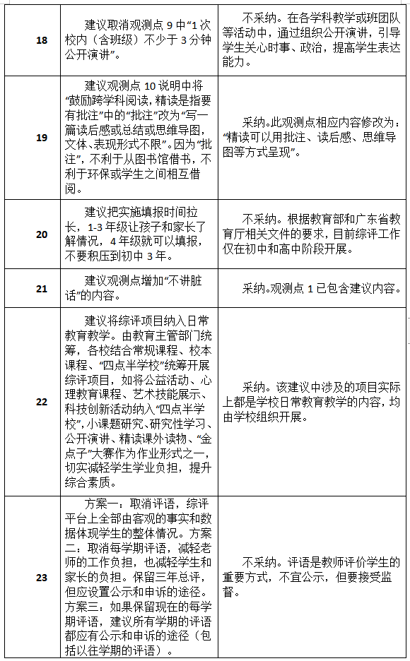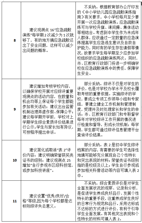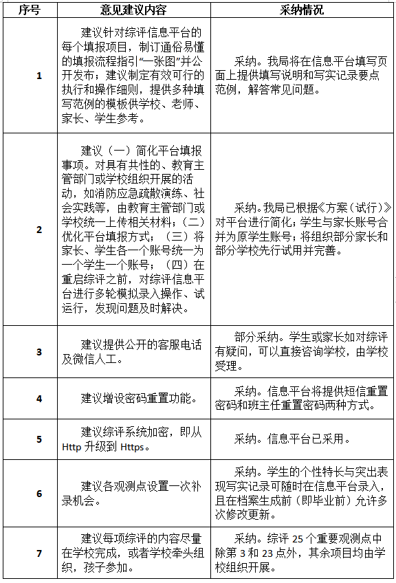 市教育局通報指出,在意見征集期間,該局共收到304個郵件及2個信件。市教育局對上述建議進(jìn)行了統(tǒng)一的分類,這些建議被分成了34類,并組織了專家學(xué)者進(jìn)行了認(rèn)真研究。其中,有關(guān)平臺簡化、允許修改更新、建立綜評宣導(dǎo)隊伍等14類建議被采納,另有5類建議被部分采納,余下15類建議沒有被采納。