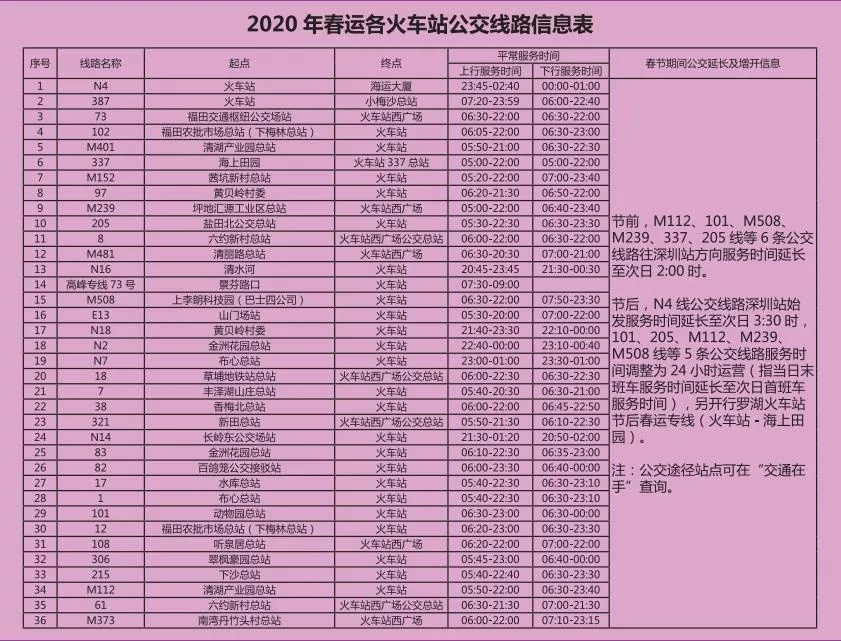 見圳客戶端·深圳新聞網(wǎng)2020年1月20日訊 又將迎來離深高峰,為方便大伙趕高鐵火車,深圳的公交地鐵都開啟最強加班模式,延長服務時間。很多小伙伴就很關(guān)心,途經(jīng)各大火車站的公交線有哪些?運營的時間是幾點?
