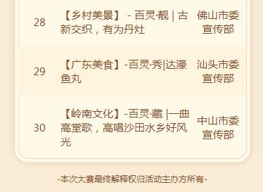 據(jù)了解,為慶祝新中國成立70周年,生動展示黨的十八大以來,廣東高舉習(xí)近平新時代中國特色社會主義思想偉大旗幟、深入推進(jìn)美麗鄉(xiāng)村建設(shè)的豐碩成果,廣東鄉(xiāng)村微視頻大賽于8月20日正式啟動。本次微視頻大賽歷時2個多月,共征集參賽作品9375條,審核展示5996條。廣東學(xué)習(xí)平臺PC端和手機(jī)APP開設(shè)參賽作品展播專題。經(jīng)過網(wǎng)上展播和網(wǎng)絡(luò)投票,以及專家評審,評選出一等獎30名,二等獎100名,三等獎1000名,以及最佳創(chuàng)意獎、最佳畫面獎、最佳人氣獎各10名。佛山、廣州、惠州等10個地級以上市黨委宣傳部獲大賽組織獎。