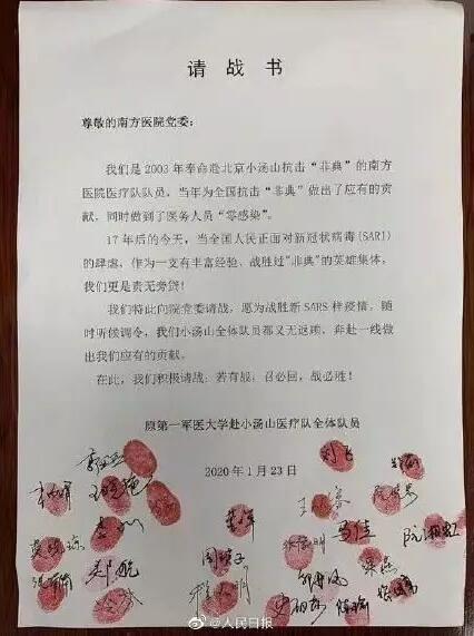 請戰(zhàn)的人員中,有十多年前曾遠(yuǎn)赴小湯山抗擊“非典”的隊員,有其他在職的醫(yī)生和護(hù)理工作者,還有表示“若有戰(zhàn),召必回!不計報酬,無論生死”的離退休老干部群體。一封寫滿簽名并按滿紅手印的“請戰(zhàn)書”,就像跳動著一顆顆紅心的畫卷,引發(fā)網(wǎng)友紛紛感動留言。