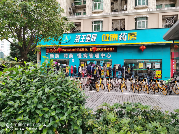 景田海王星辰藥店門口,深圳市民戴口罩排隊(duì)購買口罩等防控物品。(蔣溪林 攝)