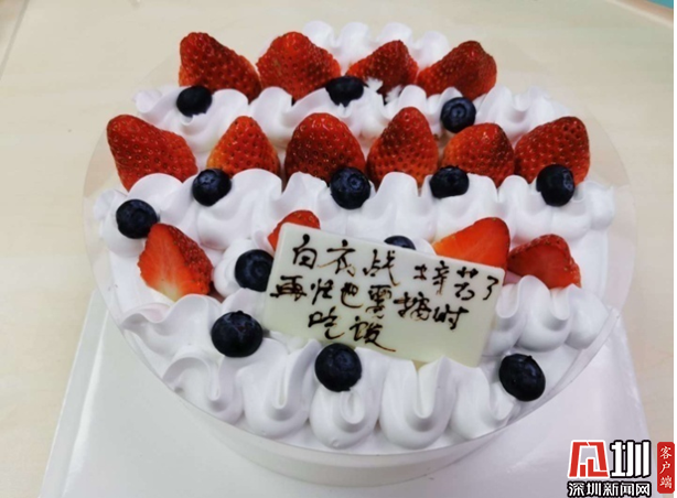 也有動情的時(shí)刻。有不知名的患者,看著我們忙碌辛勤、連飯顧不上吃一口、連水來不及喝一口,偷偷送上一份香甜蛋糕。蛋糕上寫著“白衣戰(zhàn)士辛苦了,再忙也要按時(shí)吃飯”,沒有留下一個(gè)名字。