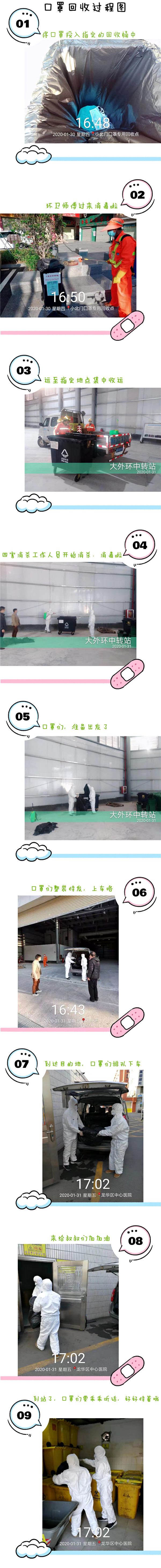 據(jù)了解,廢棄口罩每天由環(huán)衛(wèi)服務(wù)公司定時(shí)收集運(yùn)送至街道回收站,再由消殺公司工作人員著防護(hù)服現(xiàn)場(chǎng)消毒后統(tǒng)一運(yùn)送到龍華區(qū)中心醫(yī)院進(jìn)行統(tǒng)一專(zhuān)業(yè)化銷(xiāo)毀處理(詳細(xì)流程見(jiàn)下圖)。整個(gè)處理流程福城街道市政管理服務(wù)中心嚴(yán)格把控,每天安排專(zhuān)人進(jìn)行現(xiàn)場(chǎng)督促處理,堅(jiān)決防止廢棄口罩因處理不當(dāng)引起的二次污染。
