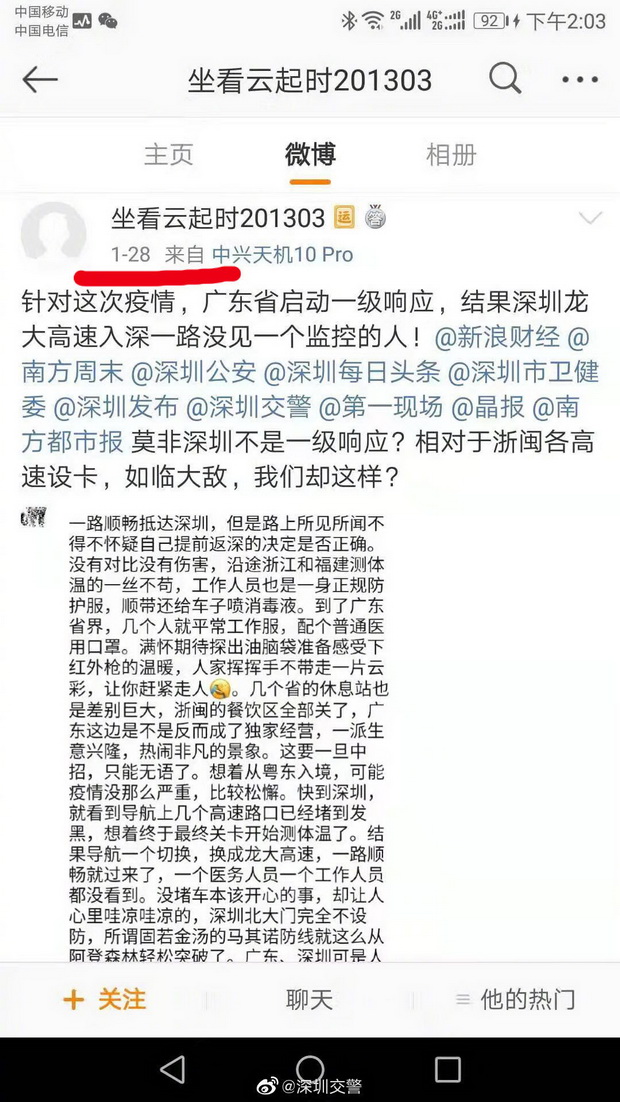 1月28日,有網(wǎng)友在社交軟件上稱深圳“不設(shè)防”,龍大高速無檢疫點。