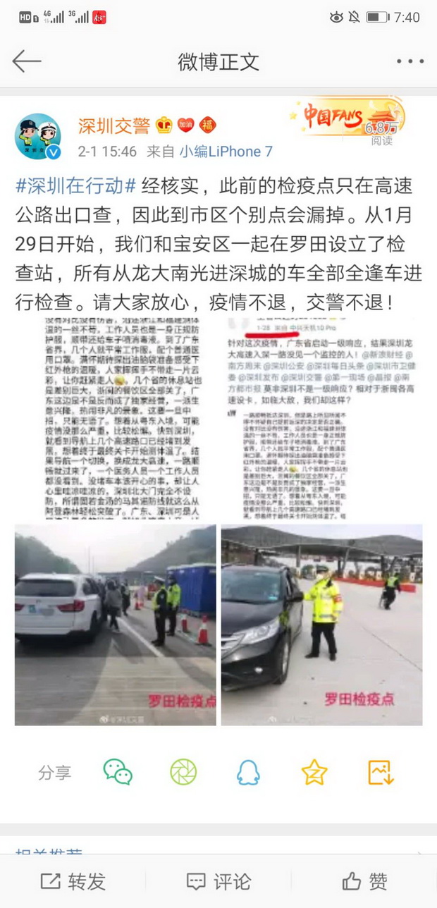 2月1日下午,深圳交警在其官方微博上表示,經(jīng)核實,此前的檢疫點只在高速公路出口查,因此到市區(qū)個別點會漏掉。從1月29日開始,深圳交警和寶安區(qū)一起在羅田設(shè)立了檢查站,所有從龍大南光進(jìn)深城的車全部全逢車進(jìn)行檢查。請大家放心,疫情不退,交警不退。