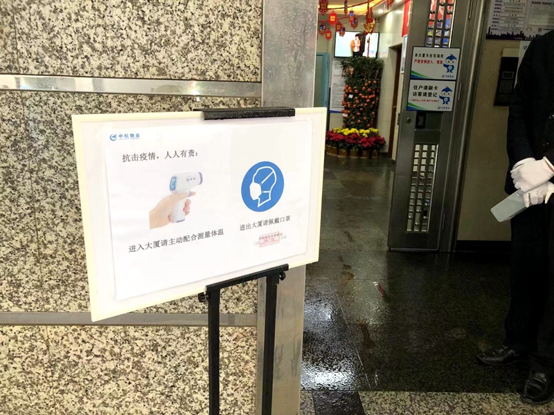 實(shí)地探訪小區(qū)防疫工作:有兩名值班保安在門(mén)口嚴(yán)格把關(guān),對(duì)每個(gè)進(jìn)入小區(qū)的住戶進(jìn)行體溫檢測(cè)。一輛灑水車(chē)正在圍繞小區(qū)噴灑消毒液。