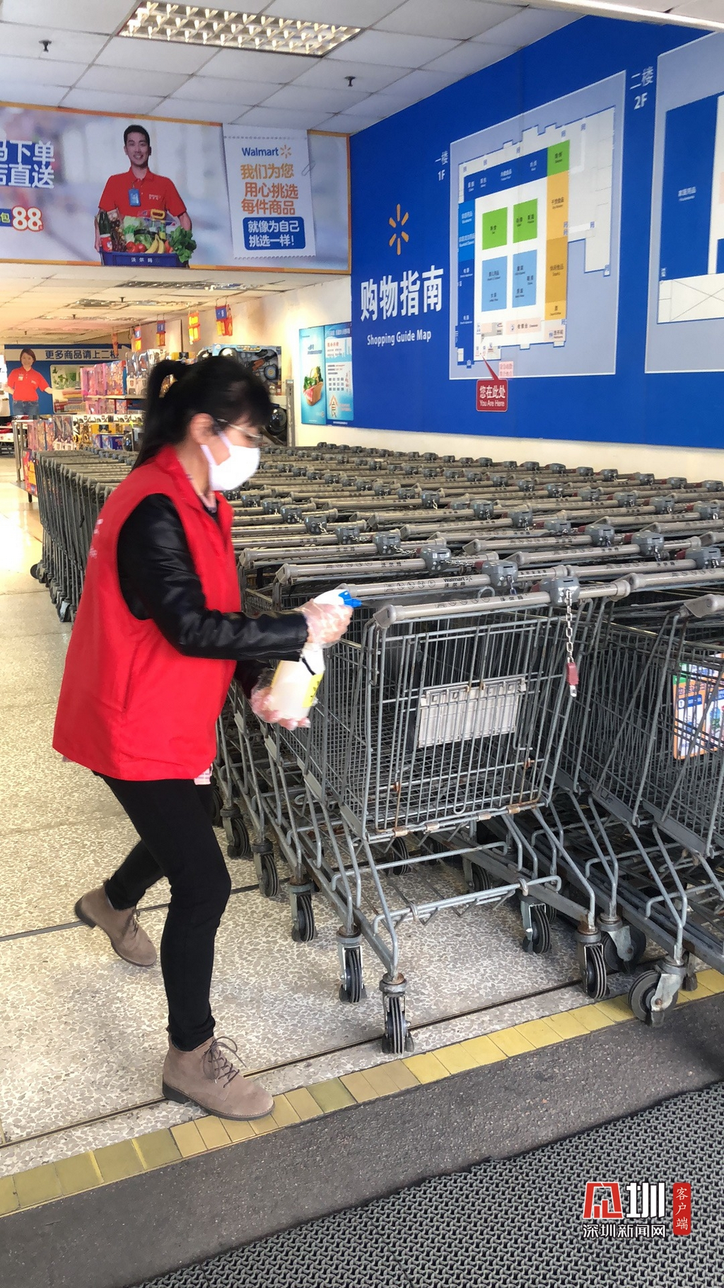 在消毒方面,景田北沃爾瑪超市每天對(duì)超市進(jìn)行高頻次消毒,包括購(gòu)物車、按鍵、門把手、出入口等人群經(jīng)常接觸的區(qū)域,并保持場(chǎng)所通風(fēng),增加空氣對(duì)流。