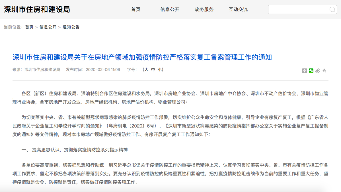 見圳客戶端·深圳新聞網(wǎng)2020年2月6日訊(見圳客戶端、深圳新聞網(wǎng)記者 潘潤華 通訊員 雷湘君)2月6日,深圳市住建局在其官網(wǎng)發(fā)布通知指出,在全省啟動重大突發(fā)公共衛(wèi)生事件一級響應(yīng)期間,暫停房地產(chǎn)項目現(xiàn)場開盤活動,暫停房地產(chǎn)中介線下帶看房活動(企業(yè)自持物業(yè)出租除外),暫停疫情重點地區(qū)現(xiàn)場評估業(yè)務(wù)活動。此外,各物業(yè)管理公司應(yīng)加強人員管理,暫停經(jīng)紀人員帶客進入小區(qū)看房活動。具體恢復(fù)時間另行通知。
