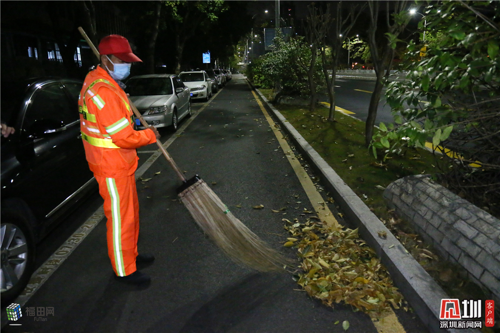 來自湖南的田朝勝,在清潔工人這個(gè)崗位已經(jīng)工作10年,每天清晨他都在清掃著這個(gè)片區(qū)路面,地面上泛黃的葉子在黑夜里被他掃的沙沙作響。他說,疫情期間,很多環(huán)衛(wèi)人員回老家后再想回深圳就沒那么容易了,有很多老鄉(xiāng)被隔離了回不來?!跋M蹅兊娜兆于s快好起來吧,2020年一天比一天過得好?!碧锍瘎俑锌?。