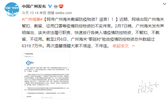 2月7日晚,廣州海關(guān)發(fā)布聲明稱,網(wǎng)絡(luò)“廣州海關(guān)暫扣、截留、征用口罩等疫情防控物資”為不實傳言。目前,廣州海關(guān)依法履行職責,快速放行各類入境疫情防控物資,不暫扣、不截留、不征用。截至2月6日,廣州海關(guān)“零延時”驗放疫情防控物資總件數(shù)超過6319.7萬件。上海、天津、寧波、大連、鄭州等地海關(guān)也紛紛辟謠,表示不會征用個人口罩。