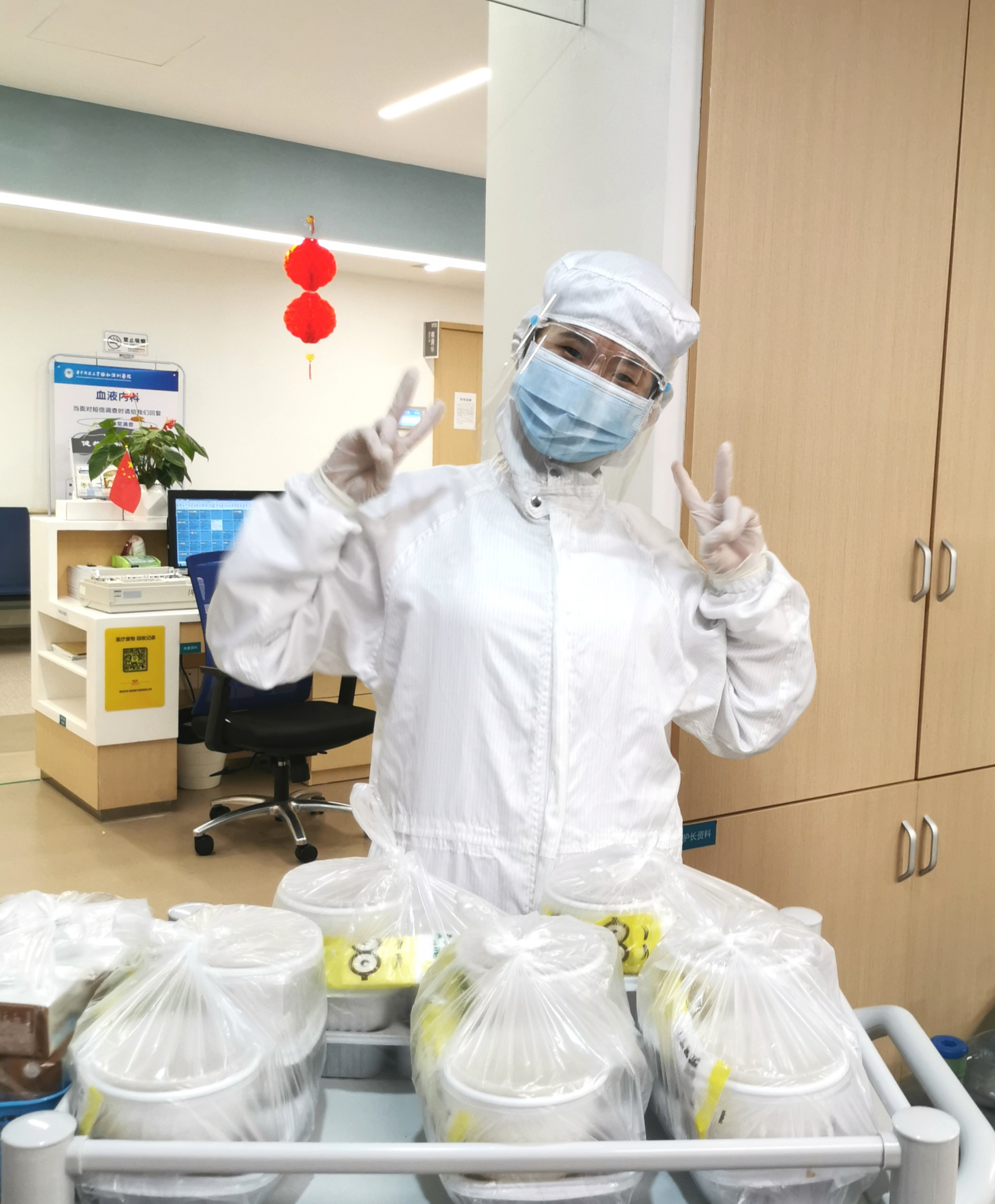 “除了一日三餐外,我們還會(huì)輪換著補(bǔ)給一些水果、點(diǎn)心、泡面、牛奶、果汁等食物和飲料,既讓他們能吃飽肚子,又能保障營養(yǎng)均衡?!眳f(xié)和深圳醫(yī)院膳食科科長彭霖麗說。同時(shí),按照醫(yī)院領(lǐng)導(dǎo)的安排,膳食科還給所有隔離留觀的病人免費(fèi)供應(yīng)一日三餐,餐飲標(biāo)準(zhǔn)與醫(yī)護(hù)人員一樣。有的病人錯(cuò)過了訂餐時(shí)間,還會(huì)及時(shí)補(bǔ)給泡面、牛奶等食物,讓他們?cè)诟綦x病房也能感受到醫(yī)院的溫暖。