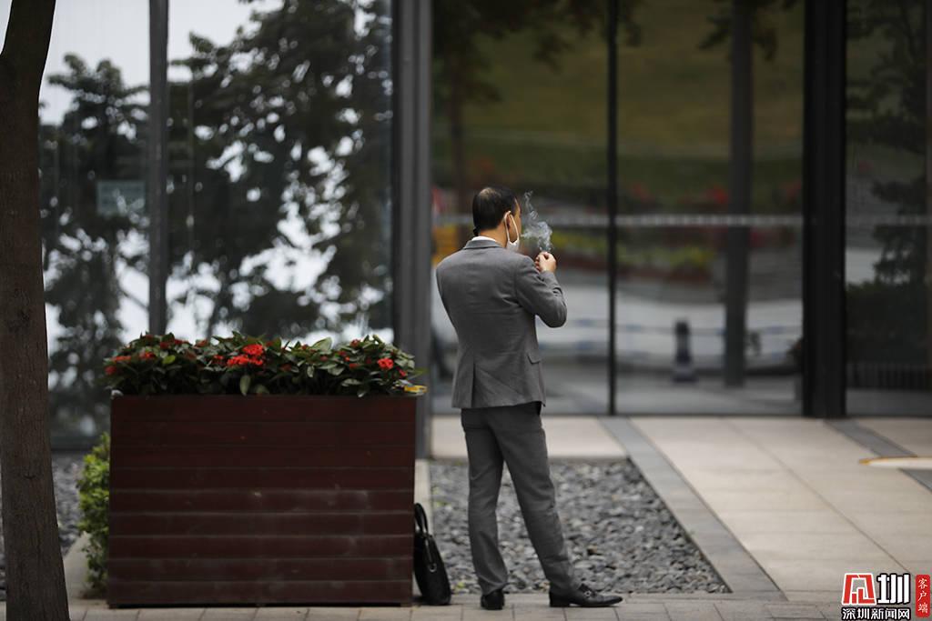 深圳軟件產(chǎn)業(yè)基地的一座辦公樓前,一位正在抽煙的上班族。