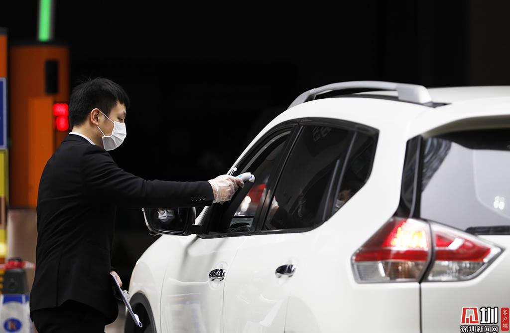 深圳軟件產(chǎn)業(yè)基地的一個停車場入口,一位工作人員正在為入場的司機測體溫。
