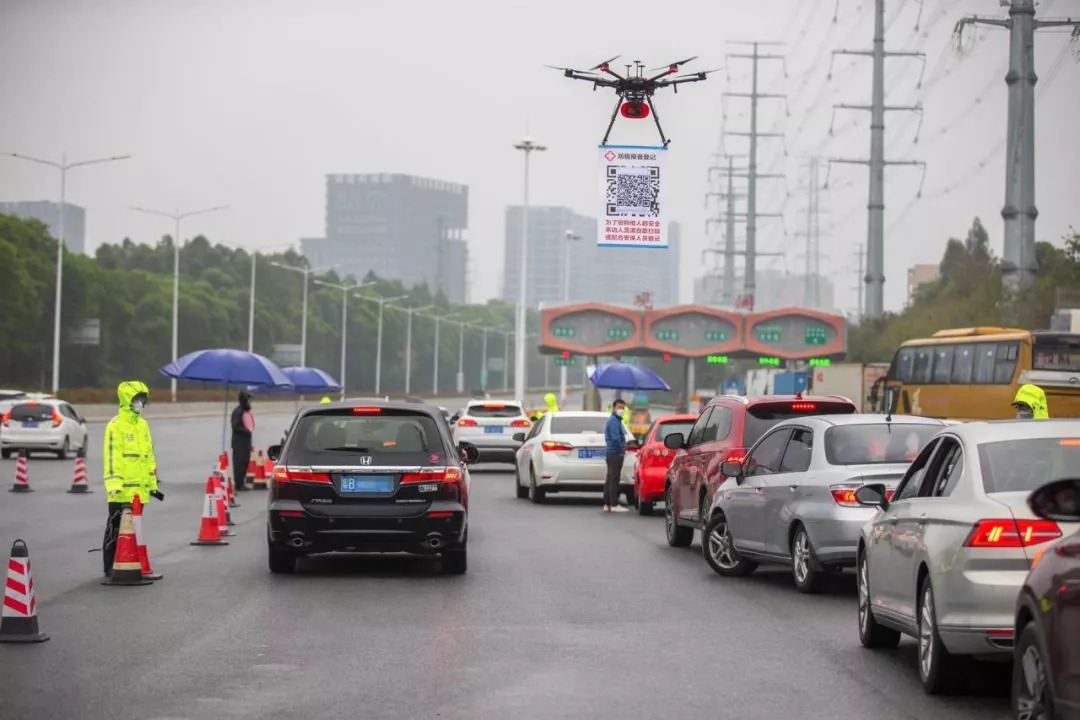 2月11日,在G94高速深圳觀瀾收費(fèi)處,深圳龍華機(jī)訓(xùn)大隊(duì)無(wú)人機(jī)飛行隊(duì)的民警操作懸掛有申報(bào)二維碼的無(wú)人機(jī)在候檢的車(chē)輛間飛行。