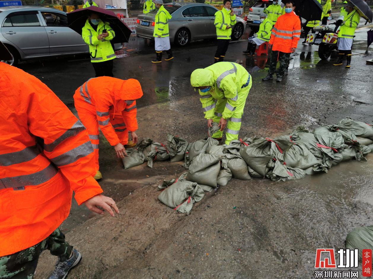 龍崗布吉街道一線工作者在路面筑沙袋墻,將雨水攔截。