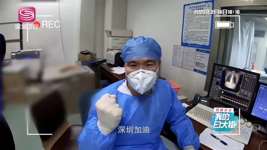 即便戴著口罩,還是能從她的語(yǔ)氣中聽(tīng)到洋溢著的幸福感。刷過(guò)醫(yī)院醫(yī)生專(zhuān)有的門(mén)禁卡,袁曉珊進(jìn)入老公的辦公區(qū)域。她老公叫黃茗勇,是深圳市第三人民醫(yī)院放射科技師。見(jiàn)到他時(shí),1米7左右的黃茗勇身上穿著藍(lán)色醫(yī)用防護(hù)服,臉上戴著白色醫(yī)用口罩?!斑@就是我老公?!痹瑫陨阂谎劬驼J(rèn)出來(lái)了。
