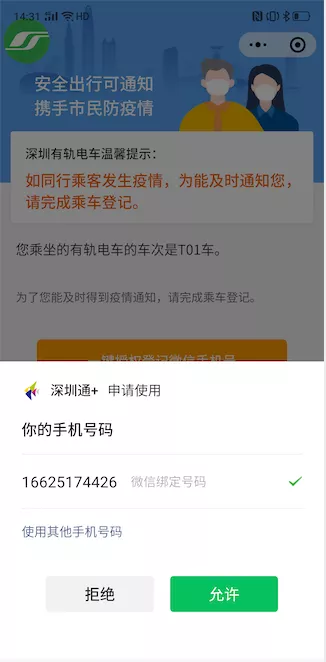 第一步:乘客使用微信掃描列車車廂內(nèi)的登記碼,登記頁(yè)面會(huì)自動(dòng)顯示上次登記的手機(jī)號(hào)或在“深圳通+”小程序中注冊(cè)的手機(jī)號(hào)碼:
