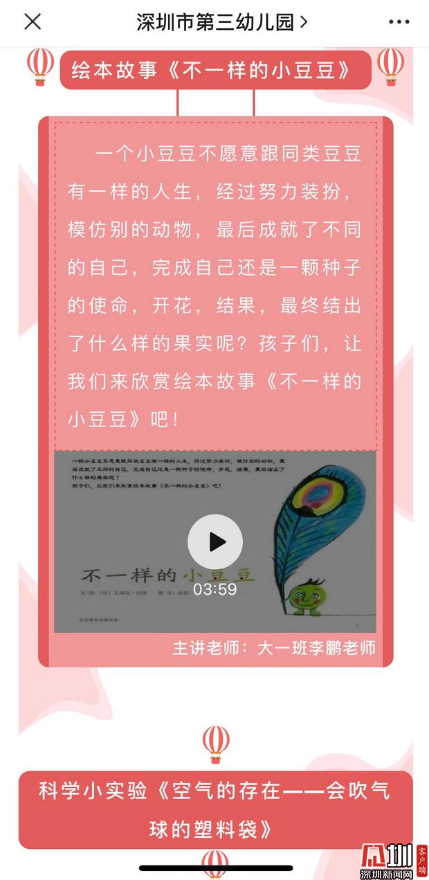 深圳市第三幼兒園園長(zhǎng)邱雪華訴記者:“目前,三幼已經(jīng)開啟線上教學(xué)活動(dòng),我們充分運(yùn)用公眾號(hào)、微信群等網(wǎng)絡(luò)平臺(tái),與家長(zhǎng)、幼兒充分互動(dòng),陸續(xù)推出具有健康促進(jìn)特色的圖文推送,其中包括介紹防疫常識(shí)的攻略、由園長(zhǎng)主講的園長(zhǎng)電臺(tái),還創(chuàng)辦了每日一期的原創(chuàng)系列游戲,以便家長(zhǎng)在家也能獲取適宜的親子游戲活動(dòng)資源?!庇浾咴谏钲谑械谌變簣@的微信公眾平臺(tái)上看到,幼兒園線上互動(dòng)內(nèi)容豐富,其中包括視頻繪本故事、科學(xué)小實(shí)驗(yàn)以及親子體育游戲。每個(gè)版塊均由深圳市第三幼兒園老師們主講示范并錄制視頻,便于孩子及家長(zhǎng)學(xué)習(xí)。