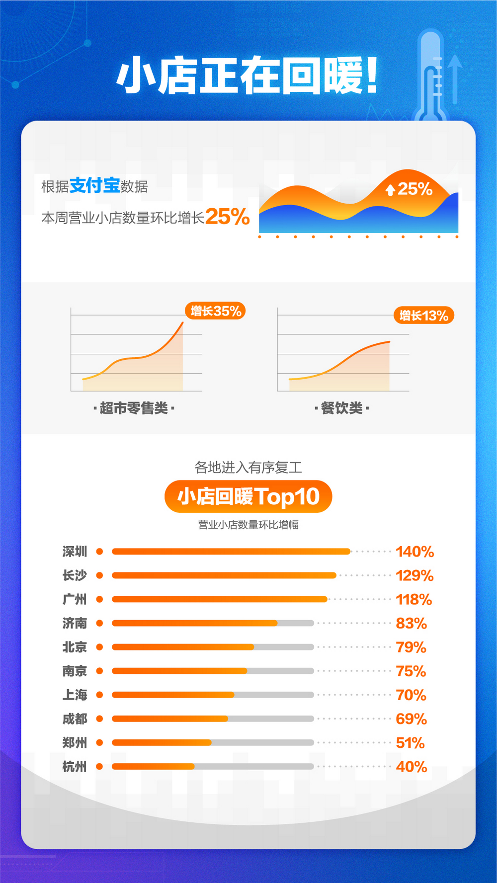 見圳客戶端·深圳新聞網(wǎng)2020年2月19日訊(見圳客戶端、深圳新聞網(wǎng)記者 陳婕)本周全國迎來新一輪復工潮,來自支付寶的最新數(shù)據(jù)顯示:本周營業(yè)小店數(shù)量環(huán)比增長25%,與百姓生活關(guān)聯(lián)度緊密的超市零售類小店,增幅達到35%。其中,深圳、長沙、廣州的增幅最大,位列前三。