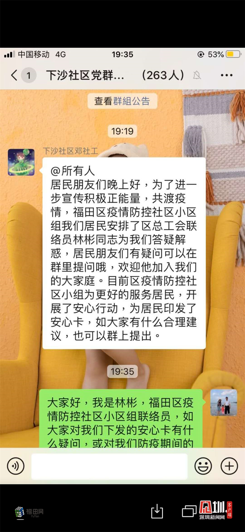 針對居民最關(guān)心自己居住的小區(qū)是否有確診病例、有無疑似病例、有無居家隔離人員的困惑,特別是出現(xiàn)了確診病例小區(qū)的居民更迫切想了解本小區(qū)采取了哪些防疫措施保證居民安全。福田區(qū)安心行動第一條就是實施小區(qū)(村)疫情防控每日一播報機制,每個重點小區(qū),工作組安排一名處級干部和一名科級干部化身安心聯(lián)絡(luò)員,進(jìn)到小區(qū)業(yè)主群,督促配合小區(qū)物業(yè)管理處按指定模板公告今日疫情防控播報,保障居民知情權(quán),同時聽取收集居民對防疫的意見建議,協(xié)調(diào)聯(lián)系解決,并反饋落實結(jié)果,對不能馬上解決的做好解釋說明。