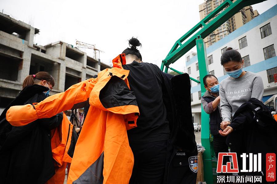 出發(fā)前,一位隊(duì)員換上沖鋒衣。