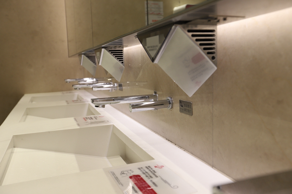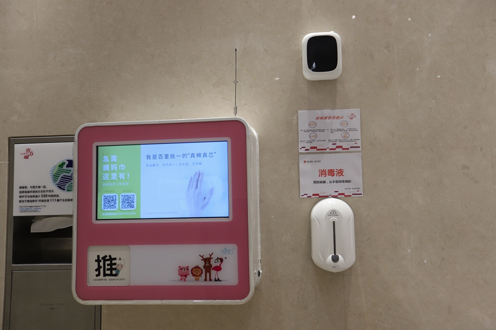 在一樓洗手間記者看到,洗手臺一側(cè)安置了消毒設(shè)備,并張貼使用提示。據(jù)悉,除了上述防疫物資,壹方城還采購了醫(yī)用手套、防護服、護目鏡以及消毒噴霧機3臺等,在所有出入口新增自動消毒設(shè)備55臺,在洗手間配置消毒設(shè)備186臺。