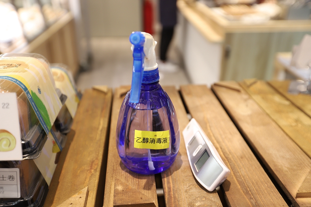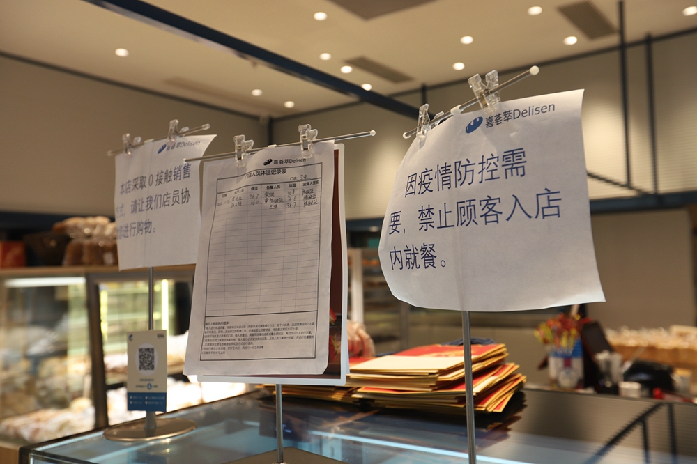 負二樓的喜薈萃是一家剛開業(yè)沒多久的面包店,記者看到里面燈光明亮、各式面包充盈貨賀,進店的通道已全部攔堵,并設(shè)置了取餐及消毒區(qū)。一名市民正在選購面包,他站在店外選好款式后,店員將面包打包好并放在取餐處,市民掃碼付款后就可以帶走了。這就是商場內(nèi)實行的“零接觸”購物。