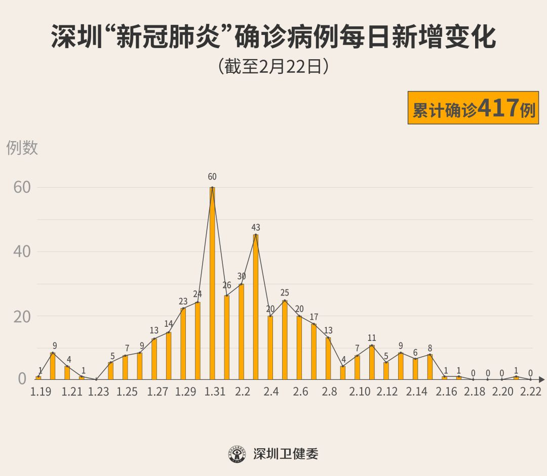 截至2月22日24時(shí),深圳累計(jì)報(bào)告“新冠肺炎”確診病例417例。2月22日當(dāng)天全市無(wú)新增確診病例,新增死亡病例1例。