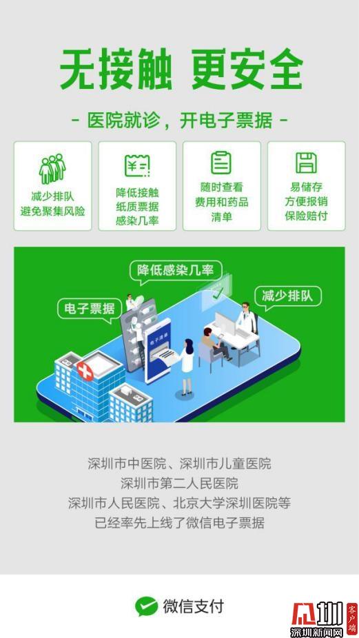 見圳客戶端·深圳新聞網2020年2月24日訊(見圳客戶端、深圳新聞網記者 陳婕)減少接觸是對抗擊疫情的最大支持。日前,微信聯合博思軟件在深圳市中醫(yī)院、深圳市兒童醫(yī)院、深圳市第二人民醫(yī)院、深圳市人民醫(yī)院、北京大學深圳醫(yī)院等醫(yī)院首期上線了醫(yī)療電子票據,為患者提供“就診繳費后通過微信領取電子票據”的服務,減少接觸人群聚集及紙質票據交叉感染的風險。