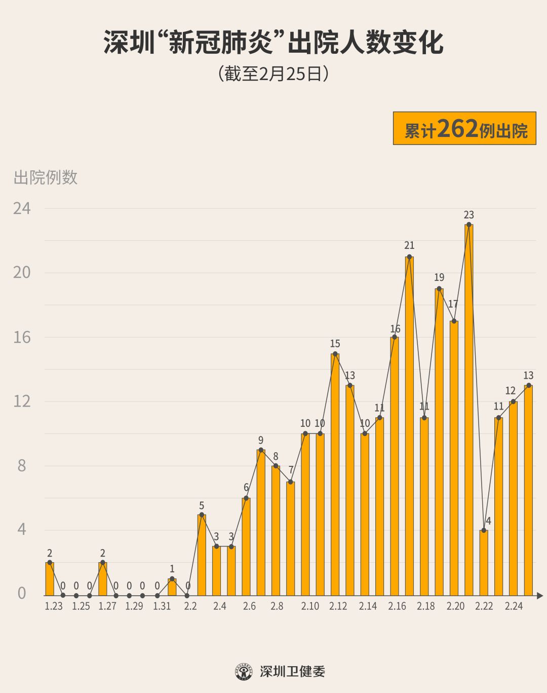 2月25日下午,經(jīng)專家組會診,深圳有13名新型冠狀病毒肺炎確診患者出院,累計達(dá)262人,連續(xù)23天有人出院。