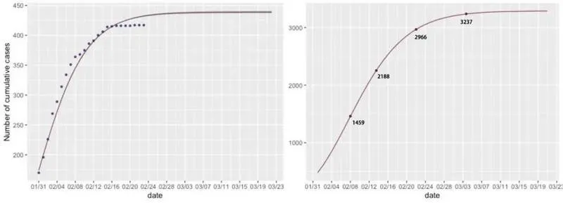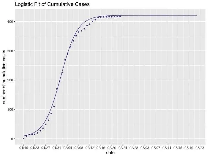 進(jìn)一步地?cái)M合深圳新冠肺炎的累計(jì)確診人數(shù),并對(duì)累計(jì)確診人數(shù)做出預(yù)測(cè)。可以看到,模型預(yù)測(cè)自2月28日起病例數(shù)不再增加,預(yù)測(cè)得到最終的累計(jì)確診人數(shù)收斂在422人左右。