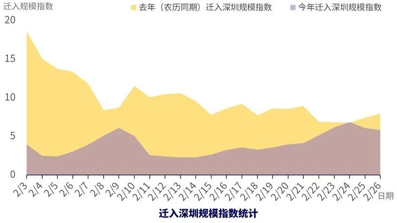 年前,深圳人口達(dá)2000萬人,春節(jié)期間最低830多萬人。從百度地圖遷徙-春運(yùn)期間遷入深圳趨勢(shì)可以看到,相比去年,年后遷入深圳規(guī)模較去年一直呈現(xiàn)平穩(wěn)的低態(tài)勢(shì),但在2月9日呈現(xiàn)出一波返程小高峰,2月14日,在深人數(shù)約1300萬人,目前約1600萬人,也就是說年后至今約有七百多萬人從外地返回深圳。