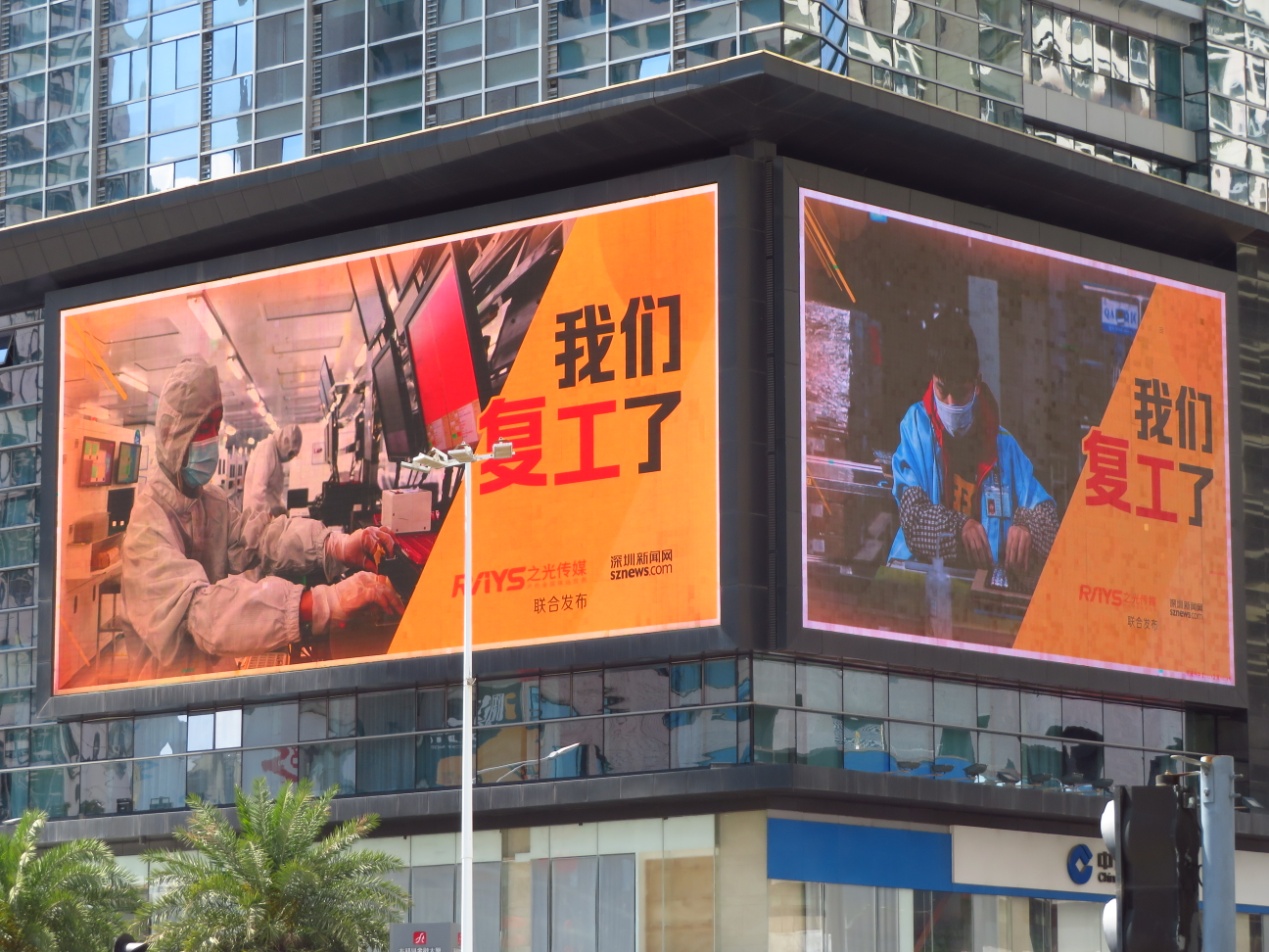 2月以來,深圳新聞網聯合之光傳媒在17塊戶外LED大屏廣告上刊登了多組不同主題的公益廣告,包括“加油中國”、“向逆行者致敬”、“瞞報就是犯罪”系列警示標語、“我們復工了”等。這些戶外大屏遍布全市各主干道和核心商圈,總面積達6000㎡,市場價值約1200萬元。