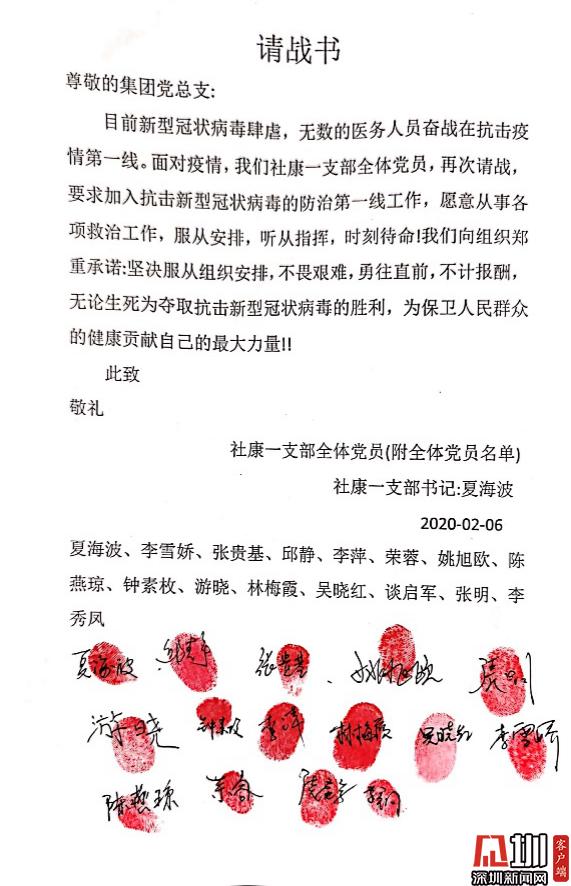 見圳客戶端·深圳新聞網(wǎng)訊(記者 董非)“讓黨旗在防控斗爭(zhēng)第一線高高飄揚(yáng)?!毙鹿诜窝滓咔榘l(fā)生以來,南山區(qū)醫(yī)療集團(tuán)總部黨員勇當(dāng)先鋒,以實(shí)際行動(dòng)踐行初心使命,涌現(xiàn)出眾多感人故事,展現(xiàn)了共產(chǎn)黨員的風(fēng)采與擔(dān)當(dāng)。 疫情發(fā)生后,南山區(qū)第一時(shí)間制定出臺(tái)了《黨建引領(lǐng)疫情防控工作五項(xiàng)行動(dòng)方案》,南山區(qū)委書記王強(qiáng)號(hào)召全體黨員,發(fā)揮黨組織的戰(zhàn)斗堡壘作用和黨員的先鋒模范作用,全力保障人民群眾生命安全和身體健康,讓黨旗在防控疫情斗爭(zhēng)第一線高高飄揚(yáng),堅(jiān)決打贏疫情防控人民戰(zhàn)爭(zhēng)、總體戰(zhàn)、阻擊戰(zhàn)。南山區(qū)醫(yī)療集團(tuán)總部積極響應(yīng),黨建引領(lǐng)下的防控抗疫工作有序科學(xué)地展開。 今年1月底,深圳市南山區(qū)區(qū)委授旗成立南山醫(yī)療系統(tǒng)黨員突擊隊(duì)。南山區(qū)醫(yī)療集團(tuán)總部緊急組建了防控新冠肺炎應(yīng)急突擊隊(duì),僅一天內(nèi)區(qū)醫(yī)療集團(tuán)就共有169人完成第一批應(yīng)急突擊隊(duì)報(bào)名,其中黨員過半數(shù)。 疾風(fēng)知?jiǎng)挪?,烈火煉真金。一封封?qǐng)戰(zhàn)書閃電匯聚到黨總支,召即來,來能戰(zhàn),戰(zhàn)能勝,沖鋒在前就是擔(dān)當(dāng)?shù)淖蠲姥堇[;一位位黨員迅速入隊(duì)黨員突擊隊(duì),他們重溫入黨誓言,在黨旗下實(shí)踐著醫(yī)者仁心、人間大愛;一份份入黨申請(qǐng)書紛沓而來,特殊時(shí)期經(jīng)受特殊考驗(yàn),一批優(yōu)秀的醫(yī)護(hù)人員頁(yè)主動(dòng)向黨組織靠攏。鏗鏘的語言、堅(jiān)定的決心、舍我的擔(dān)當(dāng),是南山區(qū)醫(yī)療集團(tuán)總部廣大黨員逆行而上、抗擊疫情的堅(jiān)定決心和必勝信心。 最美逆行黨支部,積極請(qǐng)戰(zhàn)敢擔(dān)當(dāng) “我是共產(chǎn)黨員,我請(qǐng)戰(zhàn)!愿為戰(zhàn)勝疫情全力以赴!”這是南山區(qū)醫(yī)療集團(tuán)總部一支部13名黨員和2名入黨積極分子聯(lián)名撰寫的《請(qǐng)戰(zhàn)書》(節(jié)選)。 面對(duì)新冠肺炎疫情,一支部黨員在夏海波支部書記夏海波的帶領(lǐng)下,在發(fā)熱門診、發(fā)熱患者預(yù)檢分診、社區(qū)“三位一體”排查等工作中,積極發(fā)揮共產(chǎn)黨員戰(zhàn)斗在一線、沖鋒在一線的模范帶頭作用,為戰(zhàn)勝新冠肺炎疫情全體黨員積極主動(dòng)請(qǐng)戰(zhàn),并向集團(tuán)黨總支遞交了請(qǐng)戰(zhàn)書。 社康一支部全體黨員的請(qǐng)戰(zhàn)書 一個(gè)個(gè)紅手印,令人淚目,彰顯著南山區(qū)醫(yī)療集團(tuán)總部白衣天使們逆行而上的使命擔(dān)當(dāng)和責(zé)任意識(shí)。 一支部書記夏海波說,“成為疫情防控工作第一線發(fā)展黨員,是面對(duì)疫情充分發(fā)揮黨員先鋒作用的具體實(shí)踐。此次請(qǐng)戰(zhàn),將更加激勵(lì)他們我們?cè)诮窈蟮墓ぷ魈貏e是近期防疫防控工作中,以黨員的標(biāo)準(zhǔn)嚴(yán)格要求自己,發(fā)揮黨員先鋒模范作用。同時(shí),也會(huì)對(duì)全院全體員工產(chǎn)生積極引領(lǐng)、鼓舞作用,以更飽滿的斗志投入防疫防控工作?!?/p> 老黨員重溫入黨誓詞,面對(duì)黨旗表決心 “我宣誓:我志愿加入中國(guó)共產(chǎn)黨……”這是一次特別的宣誓。接到組織號(hào)召后,社康二支部的老黨員鐘達(dá)宏和吳麗娉,對(duì)著黨旗,以重溫入黨誓詞的方式,不忘黨員初心,牢記使命,積極沖鋒在前,誓要打贏防控狙擊戰(zhàn)。 社康二支部的老黨員鐘達(dá)宏和吳麗娉,對(duì)著黨旗,重溫入黨誓詞,誓要打贏防控狙擊戰(zhàn) 面對(duì)來勢(shì)洶洶的疫情,南山區(qū)醫(yī)療集團(tuán)總部的黨組織和黨員干部不但沒有被嚇倒,反而激起了他們昂揚(yáng)的戰(zhàn)斗意志和飽滿的工作熱情。 “我宣誓,我自愿加入抗擊新型冠狀病毒肺炎疫情防控工作隊(duì)伍,責(zé)任上肩,聽黨指揮,服從命令,科學(xué)應(yīng)對(duì),恪盡職守,努力守護(hù)轄區(qū)居民健康,堅(jiān)決打贏疫情防控攻堅(jiān)戰(zhàn)!”守土有責(zé)、守土擔(dān)責(zé)、守土盡責(zé),所有社康中心的黨員干部將筑牢抗疫的基層防線,誓要守護(hù)轄區(qū)居民的生命健康。 社康二支部黨員在黨旗下宣誓努力守護(hù)轄區(qū)居民健康 艱難時(shí)刻主動(dòng)請(qǐng)戰(zhàn),夫妻雙雙奮戰(zhàn)一線 1月26日,南山區(qū)醫(yī)療集團(tuán)總部下發(fā)關(guān)于組建防控新型冠狀病毒感染肺炎應(yīng)急突擊隊(duì)報(bào)名的通知。除了得到集團(tuán)黨員們的積極響應(yīng)之外,各個(gè)支部涌現(xiàn)出一波遞交入黨申請(qǐng)書的小高潮。 李婧是社康支部的一名全科醫(yī)生,一直在社康醫(yī)院中心從事全科醫(yī)療工作,戰(zhàn)“疫”的號(hào)角吹響,李婧第一時(shí)間參戰(zhàn),在所有抗疫時(shí)期入黨人員里第一個(gè)遞交了手寫入黨申請(qǐng)書。 李婧醫(yī)生的手寫入黨申請(qǐng)書 起初,她所在的蔚藍(lán)海岸社康中心考慮到李婧的愛人是深圳市公立醫(yī)院急診科醫(yī)生其愛人是深圳市某公立醫(yī)院的急診科醫(yī)生,疫情發(fā)生以來一直堅(jiān)守在崗位上,家中尚有1歲零3個(gè)月的寶寶,就沒有讓她參加社區(qū)“三位一體”排