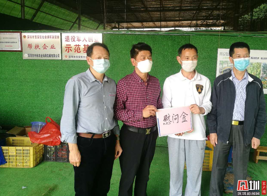 2月22日下午,寶安區(qū)退役軍人事務(wù)局局長劉偉、 寶安 區(qū)社會擁軍聯(lián)誼會會長李新華, 以及匯駿豐資產(chǎn)管理有限公司黨支部代表等人 , 專門驅(qū)車前往深圳市中樺農(nóng)業(yè)科研發(fā)展有限公司位于寶安區(qū)燕羅街道的蔬菜基地,慰問該公司員工并送上慰問金。