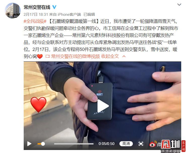 2月18日,一場大雪降臨常州,風(fēng)大雪大溫度低,常州各單位一線工作者堅守崗位,一如既往地扎實做好疫情防控工作。烯旺科技聯(lián)合兄弟企業(yè)常州第六元素向奮斗中在抗疫中執(zhí)勤一線的常州交警支隊,惠山區(qū)公安局、惠山經(jīng)濟開發(fā)區(qū)執(zhí)勤人員捐贈共計160件純石墨烯發(fā)熱馬甲,價值23.7萬元,以此向一線工作者送去溫暖,并致以崇高的敬意。