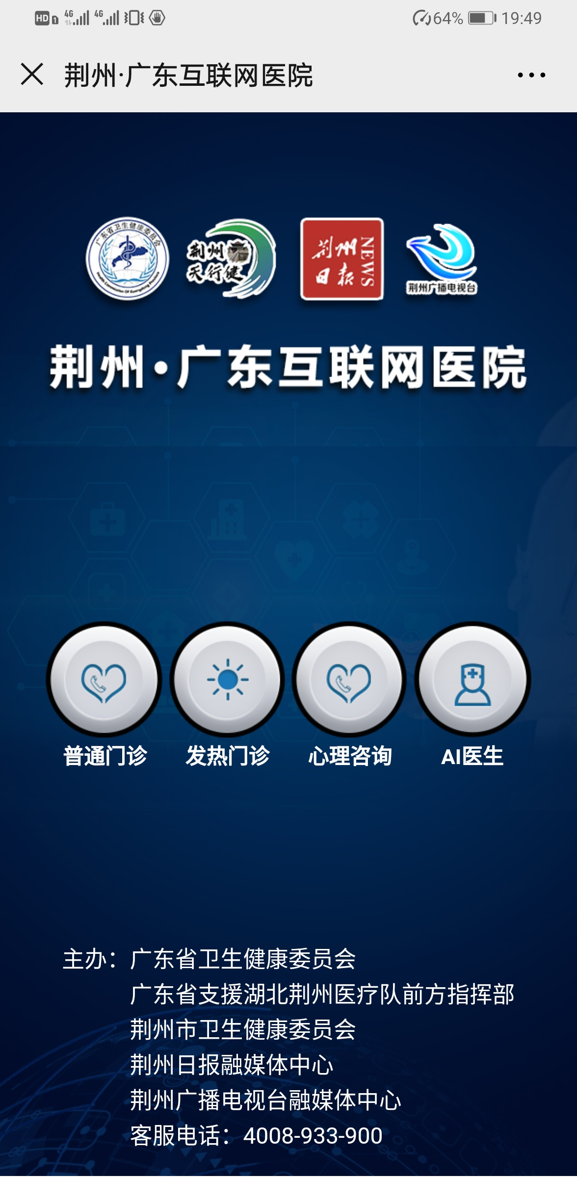 這家互聯(lián)網(wǎng)醫(yī)院是由廣東省衛(wèi)生健康委和廣東支援湖北荊州醫(yī)療隊(duì)前方指揮部聯(lián)合,在充分研判荊州疫情防控形勢(shì)的基礎(chǔ)上組建的網(wǎng)上醫(yī)療隊(duì),實(shí)現(xiàn)荊州市民足不出戶,即可享受后方優(yōu)質(zhì)的線上服務(wù)資源,為前方“主戰(zhàn)場(chǎng)”減負(fù)。