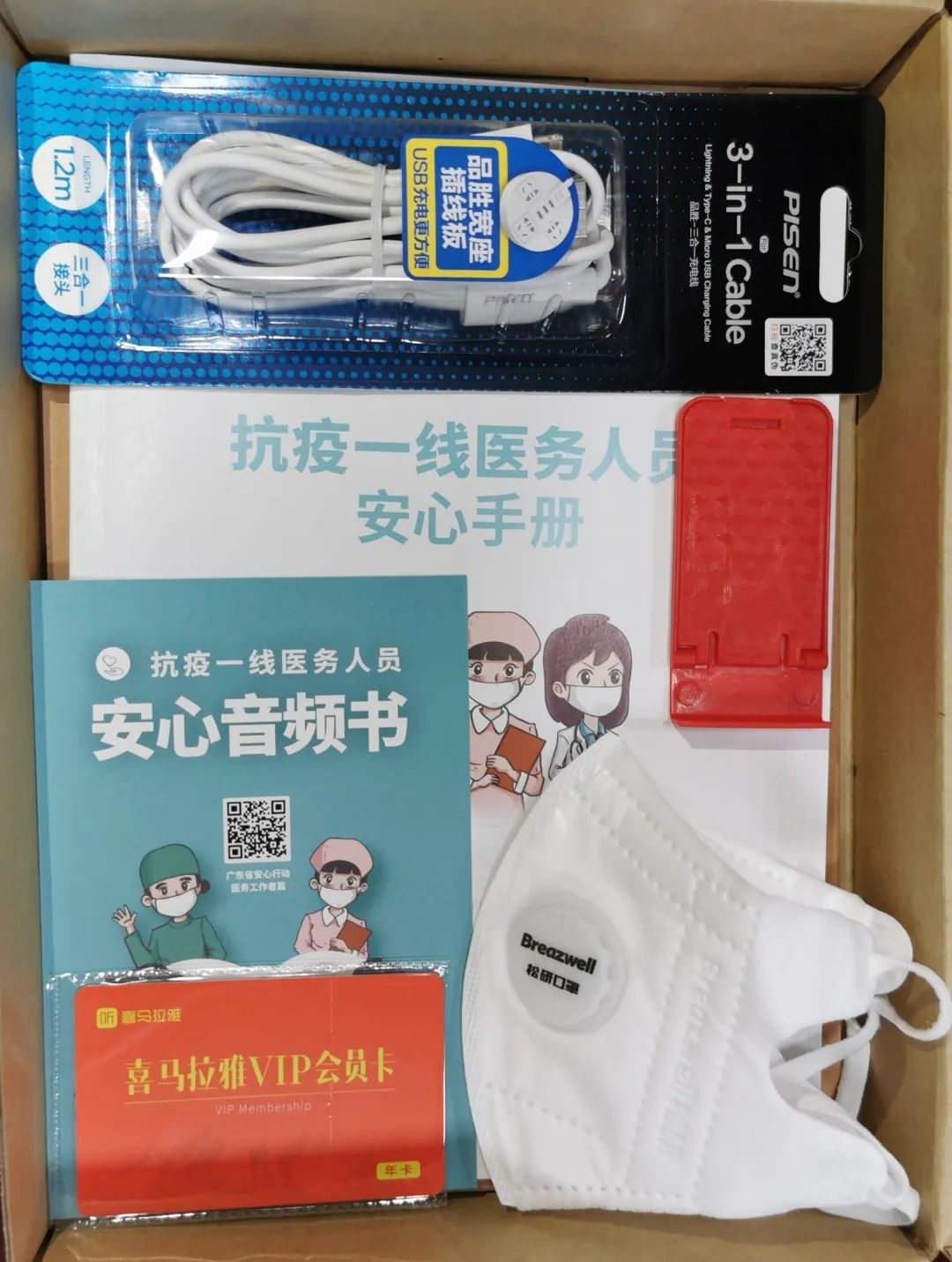 這是一個20x28cm2的普通牛皮紙紙盒,里面最顯眼的,是一本《安心手冊》,一張“抗疫一線醫(yī)務(wù)人員安心音頻書”卡,一張音頻APP的有聲書卡,和兩個N95口罩。此外,筆記本、筆、手機充電線、手機支架,也都細(xì)心地配全了。紙盒旁還放著一個小巧玲瓏的智能聲控音箱,使用者“不沾手”就能使用,防止病毒傳播。小東西里,也藏著大關(guān)愛。