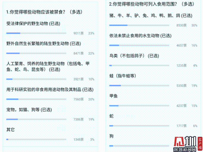 2月26日,深圳新聞網(wǎng)微信公眾號發(fā)布正在征求意見的《條例》后,當(dāng)天傍晚有超過9000名網(wǎng)友參與投票,熱情高漲的網(wǎng)友還留言戲稱廣東菜譜“水魚燜雞”或許從此退出,也有人猜測以田雞(牛蛙)為主打的餐館要“涼涼”了。(相關(guān)報道:深圳最嚴(yán)禁食野生動物條例征求意見近萬網(wǎng)友投票:甲魚牛蛙該不該被禁?)