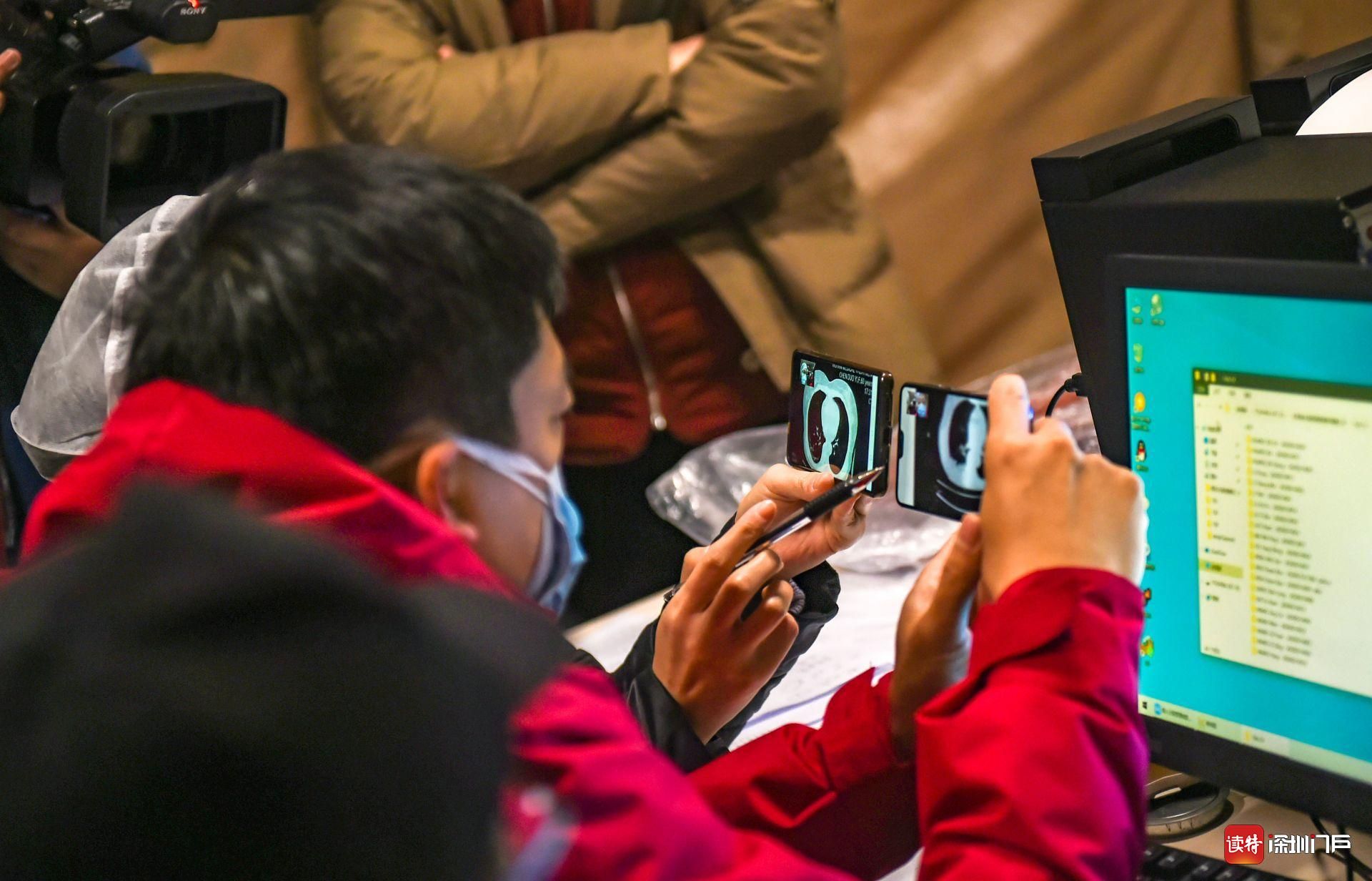 方艙外的帳篷辦公區(qū)內(nèi),醫(yī)生連線艙內(nèi)為患者會診。