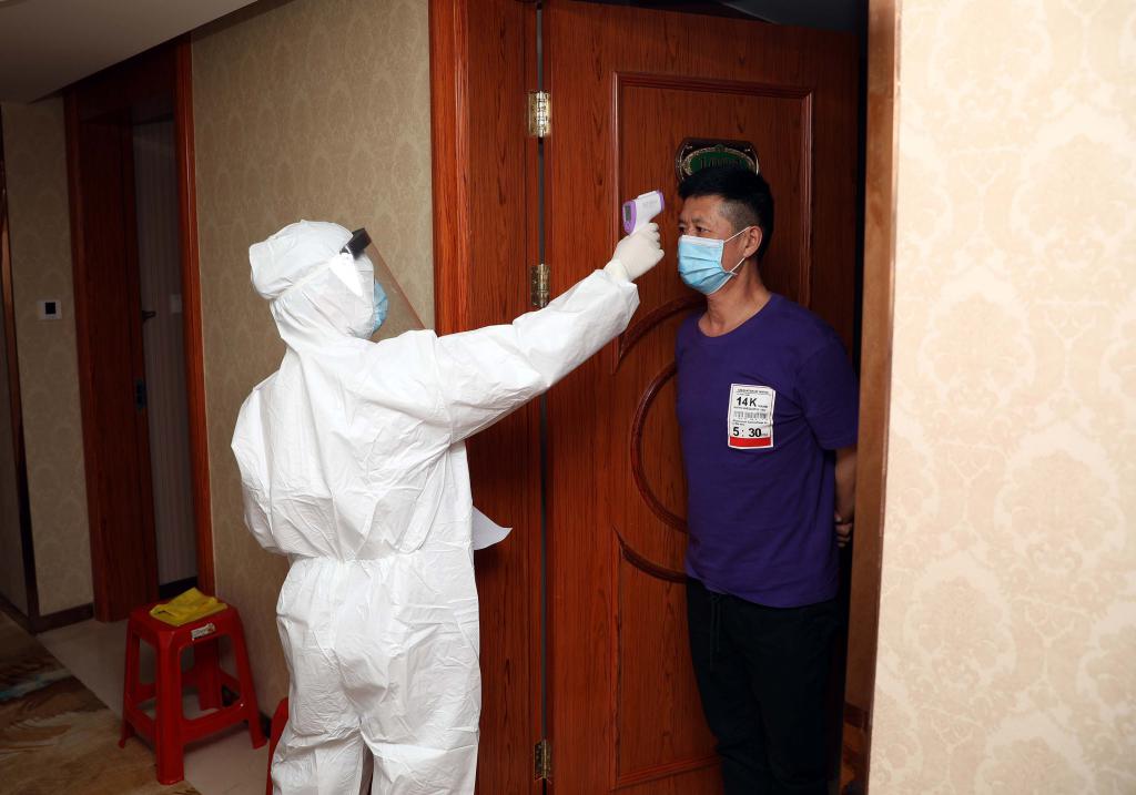 ▲醫(yī)護人員給南園街道健康驛站的臨時醫(yī)學觀察人員測量體溫。楊少昆攝