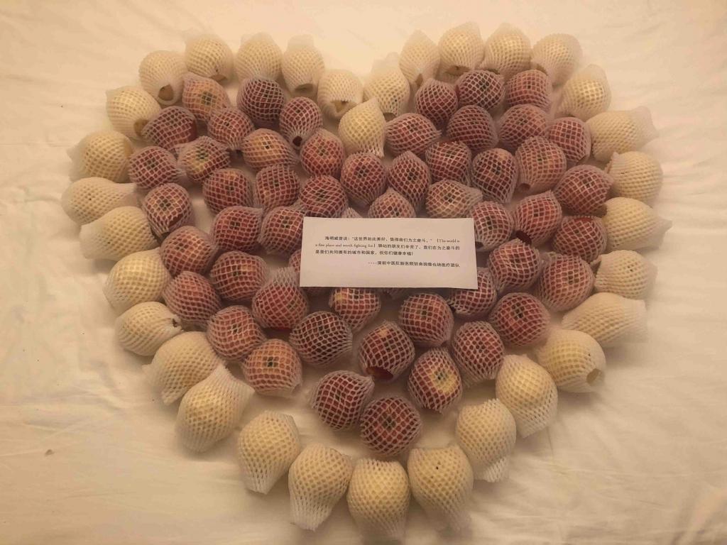 ▲深圳中醫(yī)肛腸醫(yī)院醫(yī)療團隊為健康驛站醫(yī)學觀察人員贈送的愛心水果。受訪者供圖