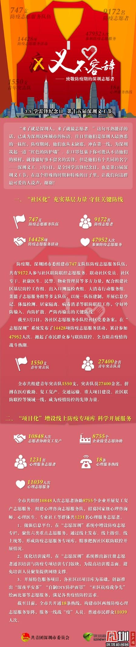 據(jù)了解,防疫期間,深圳團(tuán)市委組建747支防疫志愿服務(wù)隊(duì)伍,共9172人參與社區(qū)聯(lián)防聯(lián)控志愿服。截至3月2日,各社區(qū)志愿服務(wù)小隊(duì)經(jīng)社區(qū)黨委備案,在“志愿深圳”系統(tǒng)發(fā)布了14428項(xiàng)防疫志愿服務(wù)活動(dòng),累計(jì)參加47952人次。在深圳戰(zhàn)“疫”的關(guān)鍵時(shí)刻,全市共組建青年突擊隊(duì)1550支,突擊隊(duì)員27400余人,拼搏在醫(yī)療救助、復(fù)工復(fù)產(chǎn)、交通運(yùn)輸、重大項(xiàng)目建設(shè)、社區(qū)聯(lián)防聯(lián)控等領(lǐng)域一線,成為疫情防控的先鋒力量。